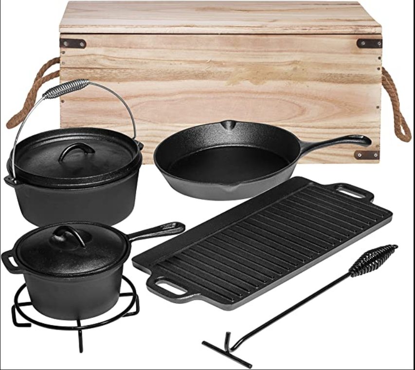 Pre-Seasoned 12″ Cast Iron Skillet, 4.5qt Dutch Oven Pot, 2.5qt Saucepot, 20″ x 9″ Heavy-duty Reversible Cast Iron Griddle. Also includes 8.6″ Trivet & Dutch Oven Lid Lifter
